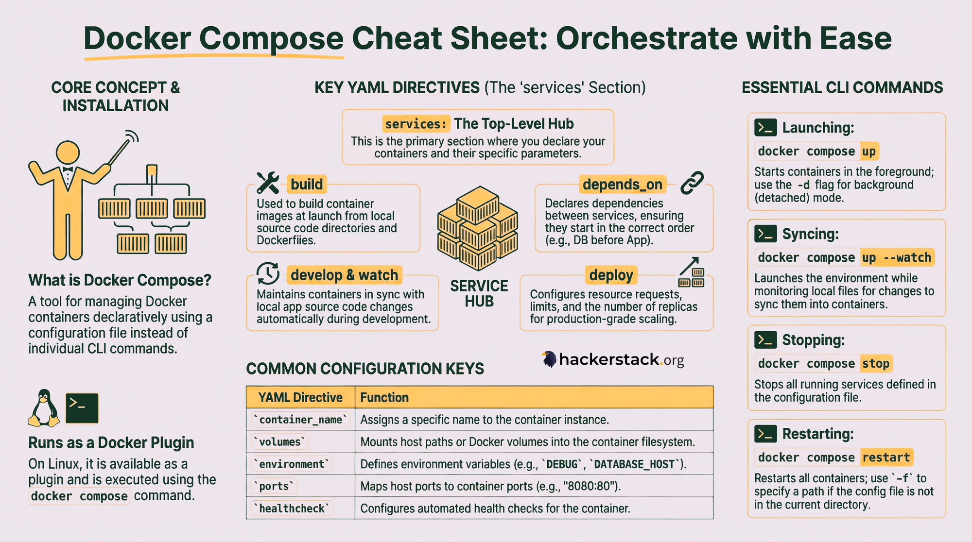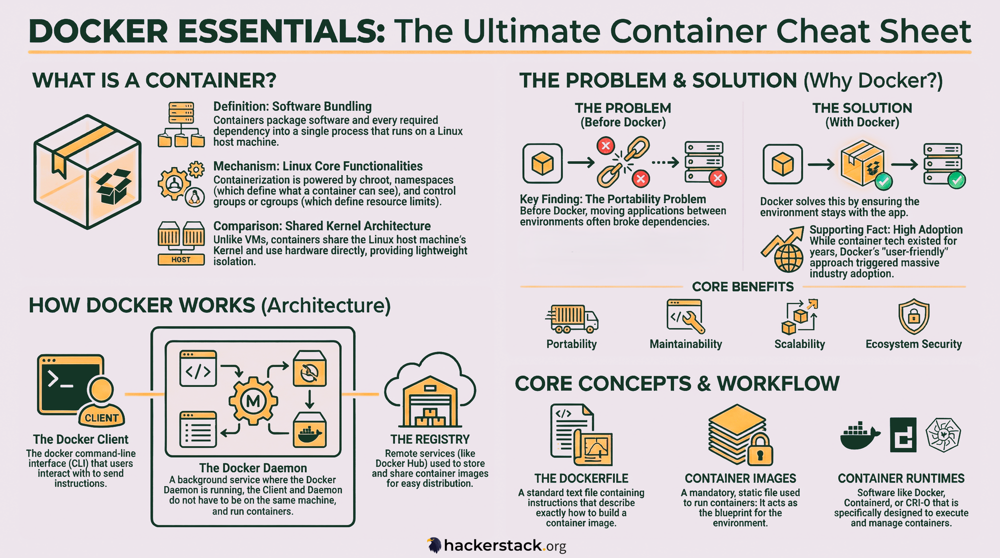 Learn Docker faster with these visuals covering essential stuff. Why Docker, the architecture, images, registries, containers, core commands and more.